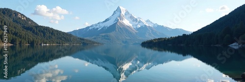 © Withun, Fototapeta premium The calm lake's surface mirrors the majestic snow-capped peak, mountain, lake, reflection