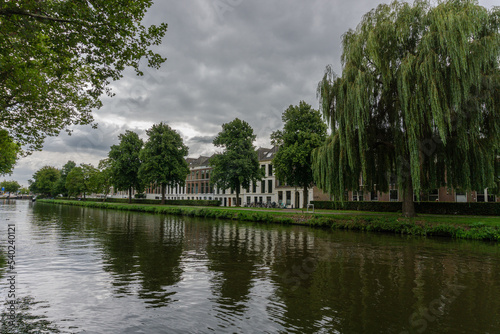 Obraz premium The canals during a cloudy day in the city of Delft, Netherlands
