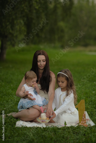 © yavdat, Naklejka premium The candid joy in a mother's eyes as she interacts with her children in the great outdoors, underscores the importance of family time and the instinctual bond of motherhood.