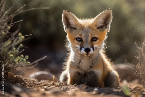 Obraz premium The Cape Fox cub emerges from the borrow to enjoy the sunshine. Generative AI