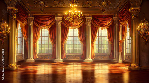 © Thiago, Obraz premium The cartoon illustration shows a palace room, a royal castle ballroom with windows, drapes, columns, and gold chandeliers. Medieval Banquet Hall. Illustration