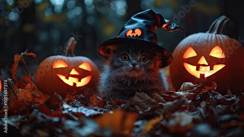 © Valentina, Naklejka premium the cat in the hat, the concept of Halloween. selective focus
