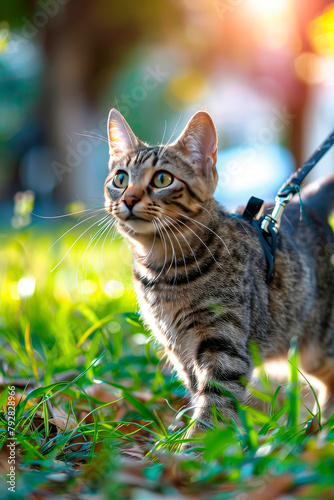 © yanadjan, Fototapeta premium the cat walks on a leash in the park. Selective focus.