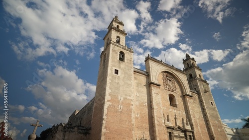 Fototapeta premium The Cathedral Ildefonso at Merida Mexico Plaza Grande with a clear blue sky.
