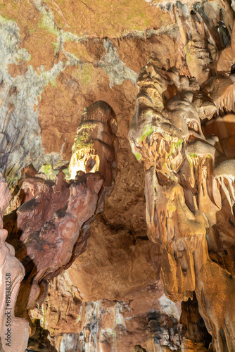 © svetograph, Naklejka premium The cave is full of rocks and has a lot of moss growing on it. The moss is green and brown in color.