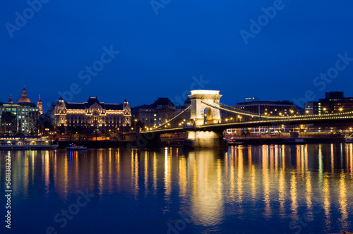 © Wildwatertv, Obraz premium The chain bridge in Budapest, Hungary, looking towards Pest, night scene
