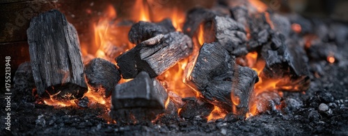 © Studio Nova, Fototapeta premium The Charcoal Embers Glowing on Hot Coals for Barbecue and Warmth