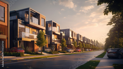 Fototapeta premium The charm of urban living through this depiction of private townhouses, where modern modular design meets sophisticated residential aesthetics.