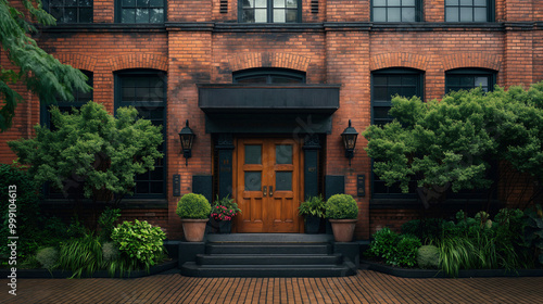 © h3design, Obraz premium The charming entrance features a sturdy wooden door framed by vibrant plants and well-kept shrubbery, creating a welcoming atmosphere in an urban area