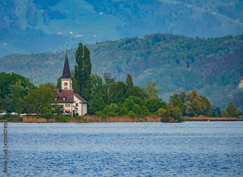 Fototapeta premium The charming village of Busskirch (Kirchdorf), Rapperswil-Jona, Sankt Gallen, Switzerland. Located in an idyllic lakeside shore of the Obersee (Upper Lake Zurich)