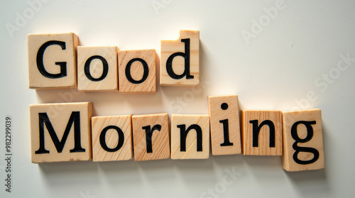Obraz premium The cheerful message Good Morning is crafted from wooden blocks, inviting positivity and warmth at the beginning of a new day. The blocks rest on a plain surface