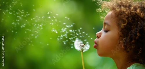 Naklejka premium The child blowing a dandelion seed head on a sunny green background