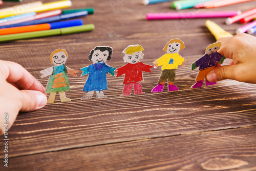Fototapeta premium the child does figures of people of paper. Paper people on wooden background....