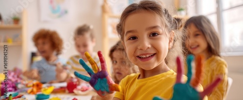 © Studio Nova, Fototapeta premium The children with colorful painted hands enjoying a joyful art class and play