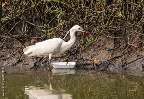 © milkovasa, Fototapeta premium The Chinese egret or Swinhoe's egret (Egretta eulophotes) walk in a polluted water