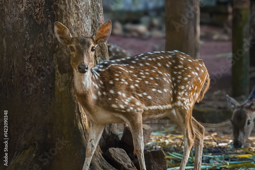 Obraz premium The chital or cheetal (Axis axis), also called spotted deer, chital deer and axis deer, is a deer species native to the Indian subcontinent.