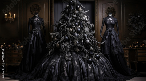 Naklejka premium The Christmas tree is decked out in black lace and ribbon, with hauntingly...