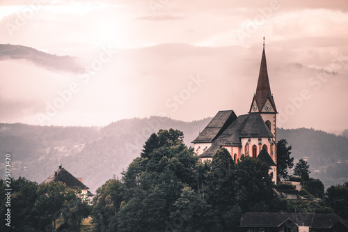 Obraz premium the Church of Maria Woerth at lake woerthersee at sunrise