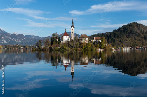 © Emil, Fototapeta premium The church on the island in the middle of lake Bled reflecting perfectly in its waters