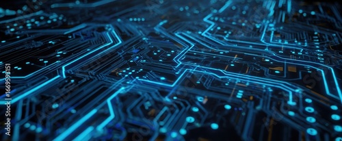 Obraz premium The Circuit Board With Glowing Blue Traces And Futuristic Electronic Network...