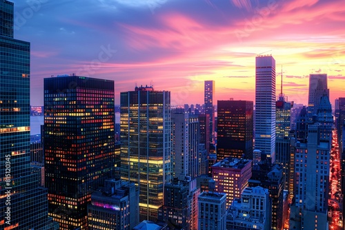 Fototapeta premium The city lights begin to twinkle as the sun sets, casting a warm glow over the urban landscape below