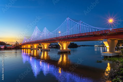 Obraz premium The city lights of Surat Thani at twilight with the Bridge and reflection over the Tapee River in Surat Thani , Thailand