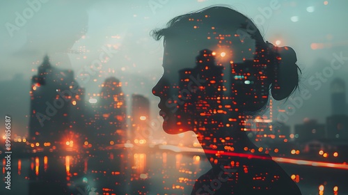 Fototapeta premium The City Lights Reflecting in a Woman's Silhouette, a Surreal and Dreamy...