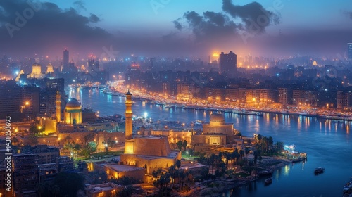 © wicha, Obraz premium The city of Cairo at night, with ancient and modern buildings glowing under thousands of lights.