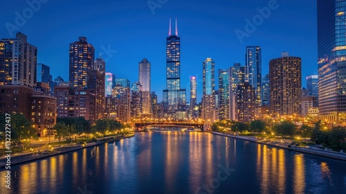 Obraz premium The city of Chicago showcases its stunning skyline at night with twinkling lights reflecting on the peaceful river. Skyscrapers stand majestically under the dark sky