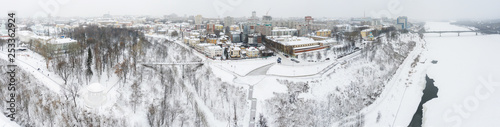© miklyxa, Obraz premium the city of Kirov and the high bank of the river Vyatka and the Alexander Grin Embankment and the rotunda on a cloudy winter day.