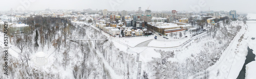 © miklyxa, Obraz premium the city of Kirov and the high bank of the river Vyatka and the Alexander Grin Embankment and the rotunda on a cloudy winter day.