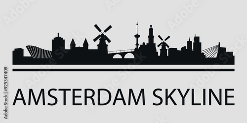 © Dima, Obraz premium The city skyline. Amsterdam. Silhouettes of buildings. Vector on a gray background