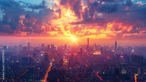 Fototapeta premium The city skyline comes alive at dusk. Showcasing the glow of a bustling city Suitable for bright and lively background themes.