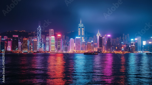Fototapeta premium The city skyline comes alive at night with skyscrapers glowing and reflections shimmering on the water's surface