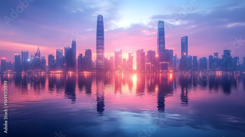 Fototapeta premium The city skyline is stunning as the sun rises, casting a warm glow on the skyscrapers reflected in the tranquil water below, creating a beautiful cityscape view.