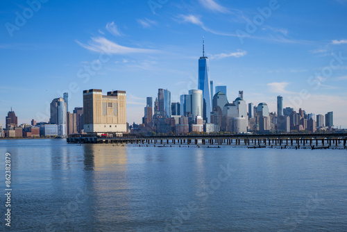 Fototapeta premium The city skyline of New York City in USA, United States. Blue sky day with iconic buildings. New York City NYC Manhattan Downtown Skyline, viewed from Jersey City, USA.