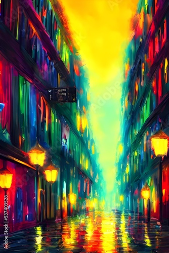© dreamyart, Naklejka premium The city street is calm and the air is fresh. The colorful streetlights illuminate the dark sky.