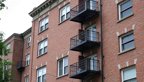 Fototapeta premium The classic brickwork of an older apartment building, with its sturdy, timeless architecture and character.