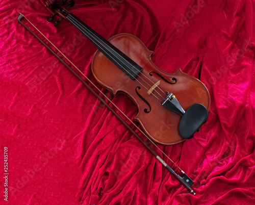 Fototapeta premium The classic violin annd bow put on red cloth background,show detail of...