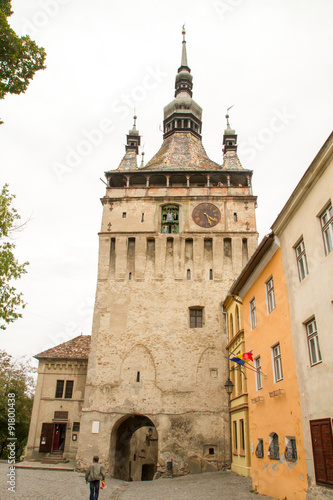 Fototapeta premium The Clock Tower on medieval street of Sighisoara, Transylvania, Romania, 10 September 2015