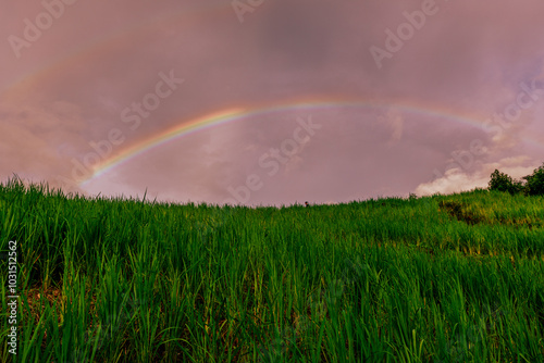 Naklejka premium The close background of the green rice fields, the seedlings that are growing, are seen in rural areas as the main occupation of rice farmers who grow rice for sale or living.