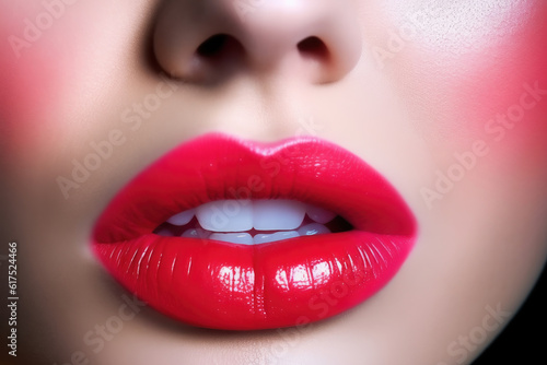 Obraz premium The close up of woman mouth shows the beautiful and sensual beauty of red lips. Makeup and lip gloss are sexy and glamorous in detail. Generative ai