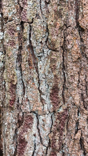 Fototapeta premium The close-up view focuses on the intricate details of the pine bark surface, its texture rough and uneven with various bumps, grooves, showing signs of age and weathering.