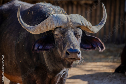Naklejka premium The closeup image of african buffalo. it is a large Sub-Saharan African bovine. They are widely regarded as among the most dangerous animals on the African continent.