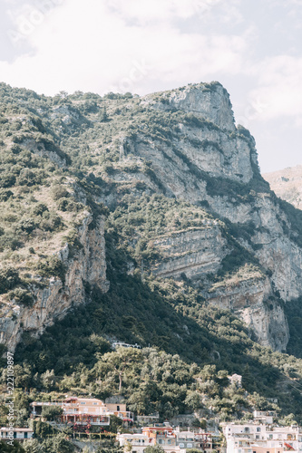 © pavelvozmischev, Naklejka premium The coast of Positano, Amalfi in Italy. Panorama of the evening city and the streets with shops and cafes. Houses by the sea and the beach. Ancient architecture and temples