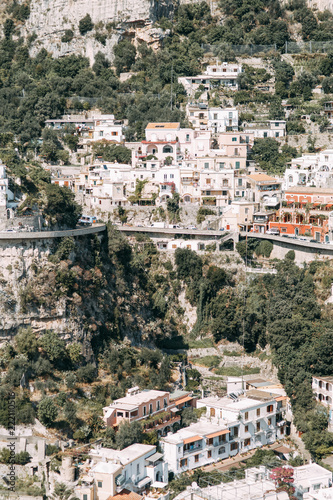 © pavelvozmischev, Naklejka premium The coast of Positano, Amalfi in Italy. Panorama of the evening city and the streets with shops and cafes. Houses by the sea and the beach. Ancient architecture and temples