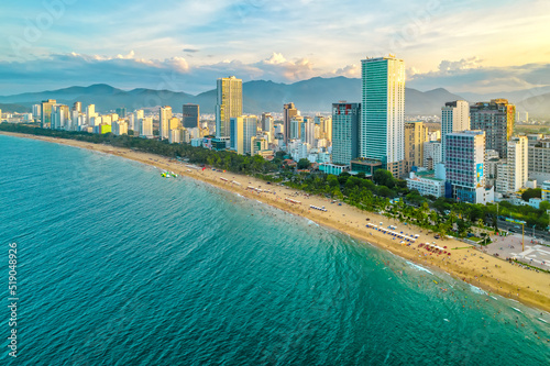 © huythoai, Obraz premium The coastal city of Nha Trang, Vietnam seen from above in the afternoon with its beautiful city and clean sandy beach attracts tourists to visit