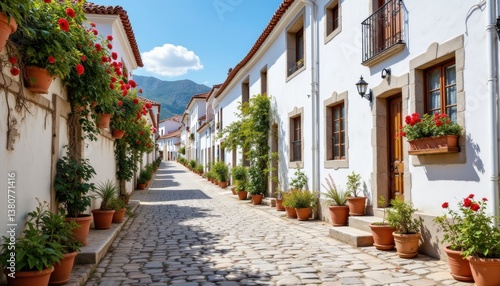 © Thi, Obraz premium The cobblestone street is lined with charming whitewashed buildings adorned with vibrant flowers