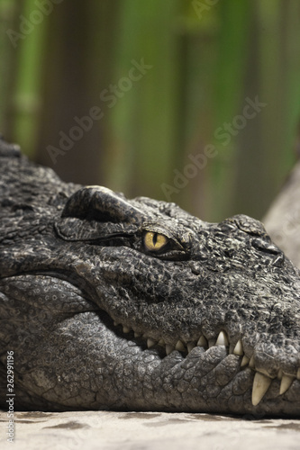 © Mikhail Semenov, Obraz premium The cold calculating yellow eye of a reptile (crocodile, dragon, dinosaur). Muzzle of a crocodile lyinglose-up. The look of a reptile.