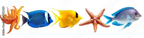 Naklejka premium The collection includes fish, starfish, octopus, and sea turtles isolated on...